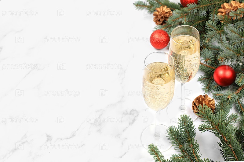 Два бокала шампанского на элегантном праздничном фоне с еловыми ветками и украшениями, концепция сочельника. Рождественский и новогодний макет для дизайна и демонстрации продукции,