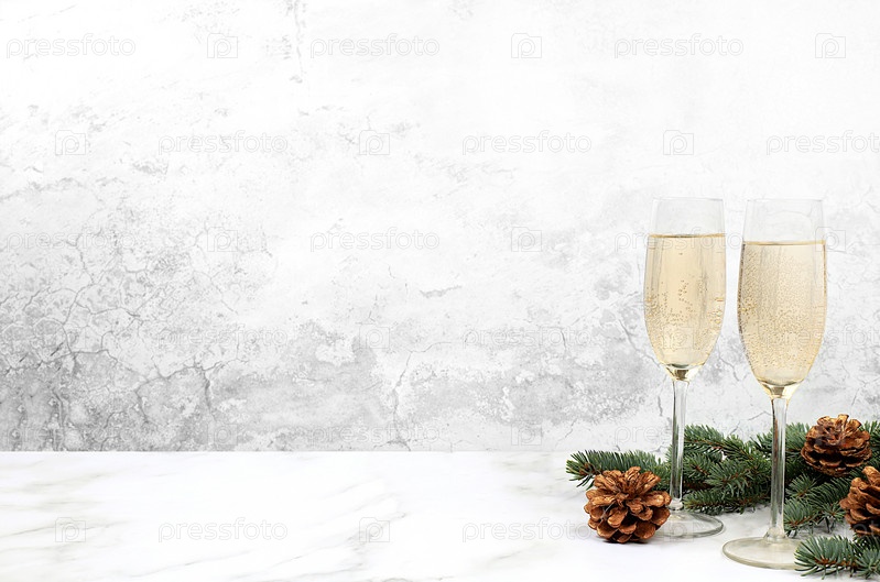 Два бокала шампанского на элегантном праздничном фоне с еловыми ветками и украшениями, концепция сочельника. Рождественский и новогодний макет для дизайна и демонстрации продукции,