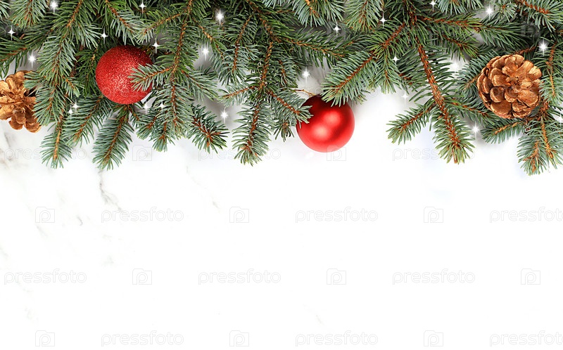 Рождество и Новый год 2024 фон с голубыми еловыми ветвями с праздничными украшениями и сосновыми шишками на светлом мраморном столе, баннер для праздничного экрана, шаблон для дизайна. Праздничная открытка, избирательный фокус,
