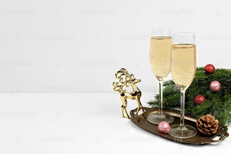 Два бокала шампанского на элегантном праздничном фоне с еловыми ветками и фигуркой оленя. Рождественский и новогодний макет для дизайна и демонстрации продукции, концепция сочельника, выборочный фокус