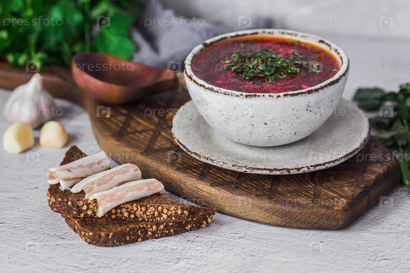 Понятие вкусной еды. Традиционный украинский, русский борщ в стильной керамической тарелке с зеленью, сметаной и чесноком. Свекольный борщ с петрушкой, кориандром и беконом с черным хлебом