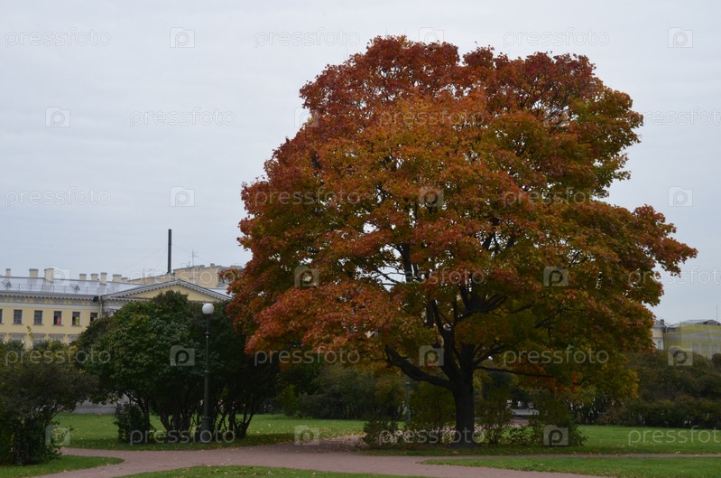 Красивый клен с яркой осенней листвой на Марсовом поле в Санкт-Петербурге