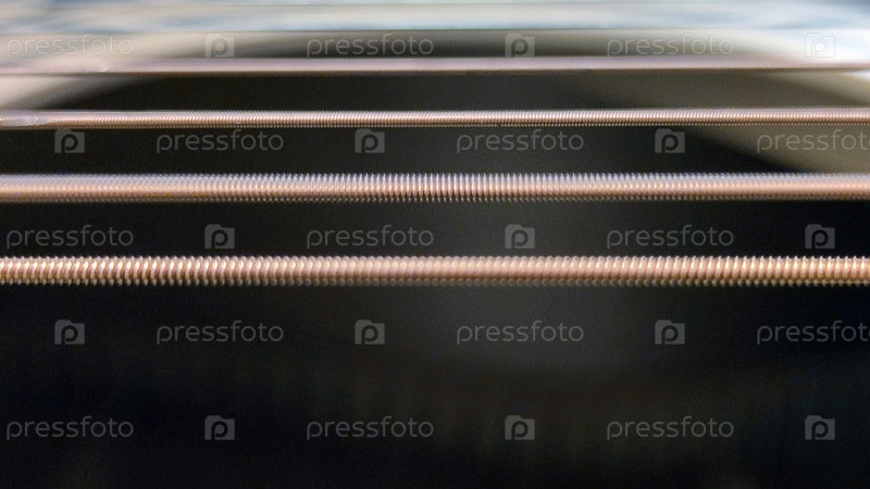 Металлические гитарные струны. Гладкая коричневая поверхность гитары, по которой натянуты струны. Они разной толщины, часть струн колеблется, издавая звук, часть покоится
