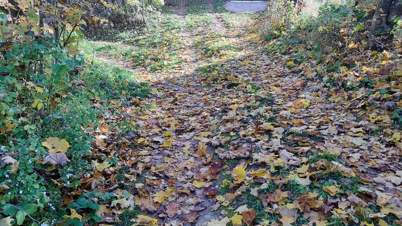 Песчаная сельская дорога. Дорога заросла травой и усыпана опавшими цветными листьями деревьев и кустарников. Листья красные, коричневые, желтые и оранжевые почти сплошным слоем