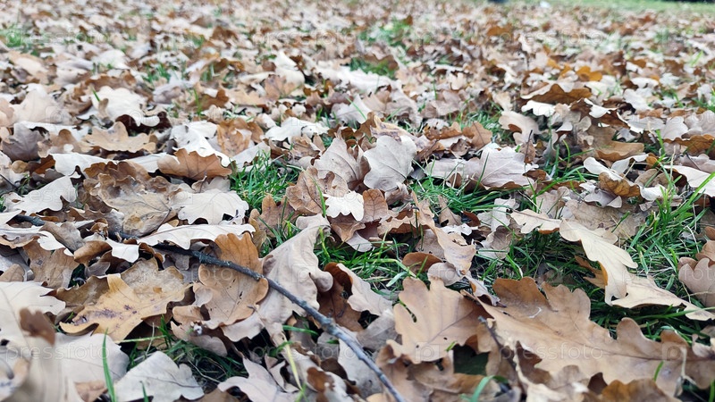 Листья не лежат на зеленой лужайке. Земля заросла травой и усыпана опавшими цветными листьями деревьев и кустарников. Листья красные, коричневые, желтые и оранжевые почти сплошным слоем