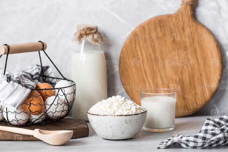 Свежие молочные продукты, молоко, творог, яйца в стильной керамической посуде на сером фоне. Концепция естественного, диетического питания. Полезные продукты