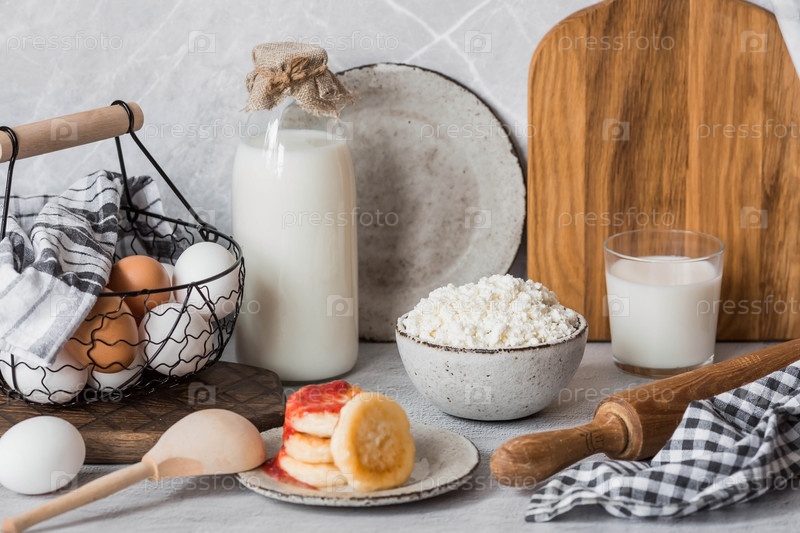 Свежие молочные продукты, молоко, творог, чизкейки, яйца в стильной керамической посуде на сером фоне. Концепция естественного, диетического питания. Полезные продукты