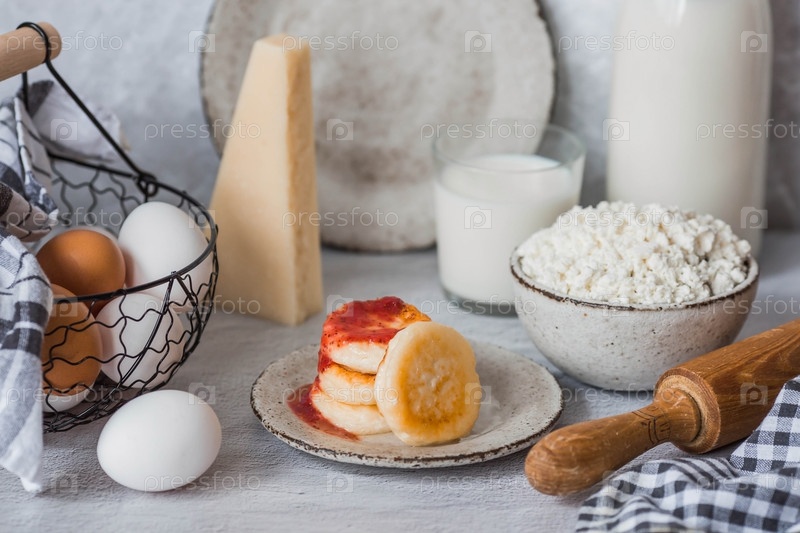 Свежие молочные продукты, молоко, творог, чизкейки, яйца в стильной керамической посуде на сером фоне. Концепция естественного, диетического питания. Полезные продукты
