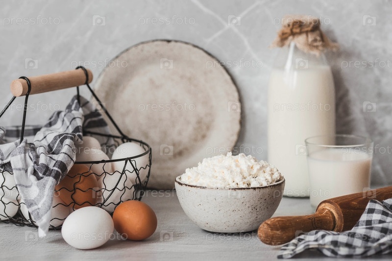 Свежие молочные продукты, молоко, творог, яйца в стильной керамической посуде на сером фоне. Концепция естественного, диетического питания. Полезные продукты