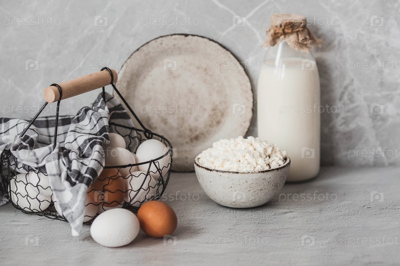 Свежие молочные продукты, молоко, творог, яйца в стильной керамической посуде на сером фоне. Концепция естественного, диетического питания. Полезные продукты