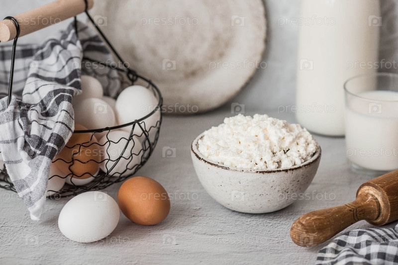 Свежие молочные продукты, молоко, творог, яйца в стильной керамической посуде на сером фоне. Концепция естественного, диетического питания. Полезные продукты