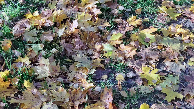 Листья не лежат на зеленой лужайке. Земля заросла травой и усыпана опавшими цветными листьями деревьев и кустарников. Листья красные, коричневые, желтые и оранжевые почти сплошным слоем