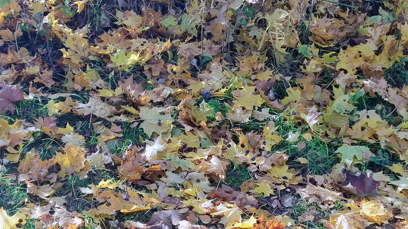 Листья не лежат на зеленой лужайке. Земля заросла травой и усыпана опавшими цветными листьями деревьев и кустарников. Листья красные, коричневые, желтые и оранжевые почти сплошным слоем