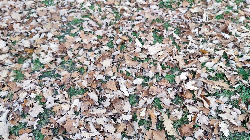 Листья не лежат на зеленой лужайке. Земля заросла травой и усыпана опавшими цветными листьями деревьев и кустарников. Листья красные, коричневые, желтые и оранжевые почти сплошным слоем