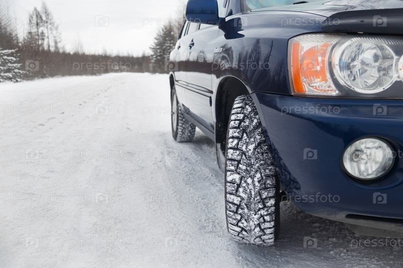 Зимняя резина на автомобиль. Безопасность вождения на заснеженных дорогах. Крупный план с размытым фоном