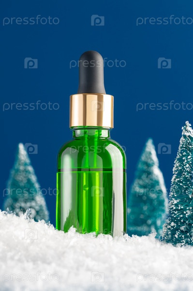 Концепция ухода за кожей в зимний сезон. Крупным планом зеленая бутылка-капельница с сывороткой для лица или маслом и рождественские елки со снегом на синем фоне с пустым пространством. Небрендовый макет для рекламы