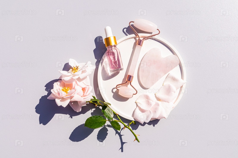 Бутылка косметического розового масла, кварцевый массажер, скребок Гуа Ша на белом керамическом подносе для домашнего массажа и ухода за собой. Вид сверху