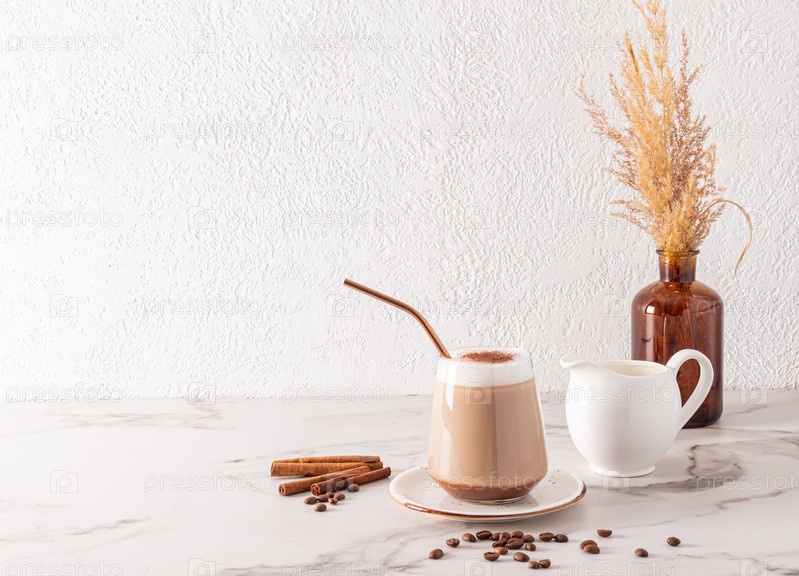 Красивый стильный натюрморт с большим стаканом свежезаваренного кофе капучино, кувшином молока, кофейными зернами и модной вазой с сухими ветками