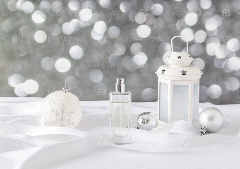 Стеклянная бутылка женских духов или косметического продукта, спрей на фоне новогоднего шара, фонарик, свет боке. Концепция новогоднего парфюма