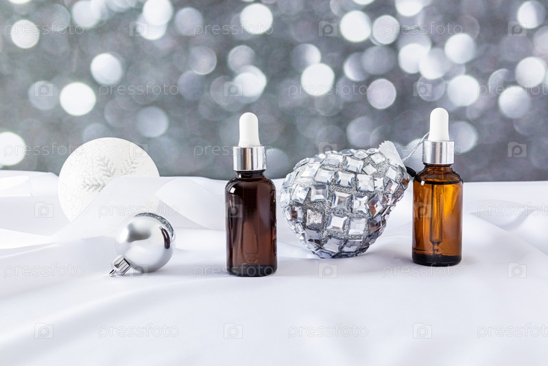 Две бутылочки-капельницы с косметическим средством по уходу за собой среди ярких серебряных рождественских игрушек на белом атласном фоне и свете боке