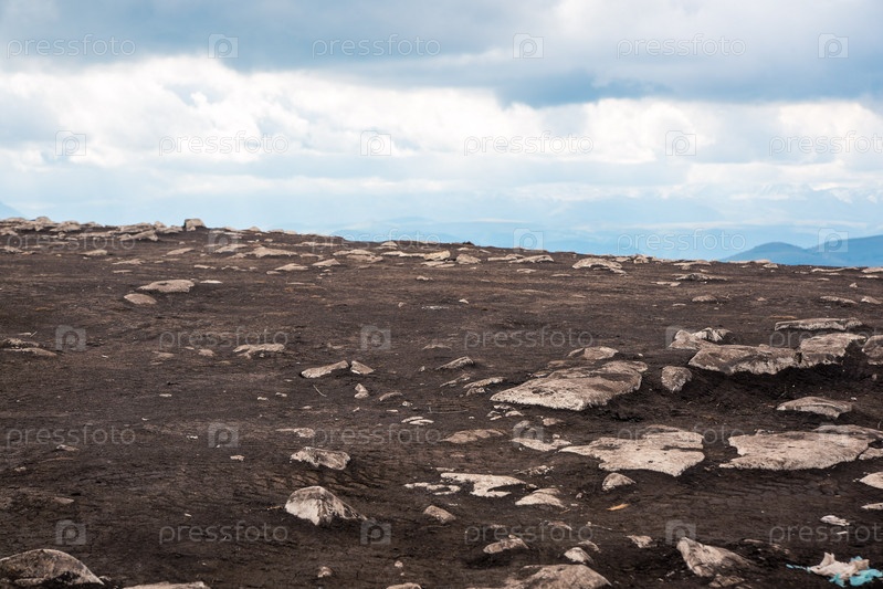 Бурая земля с торчащими камнями. Голубое и белое небо