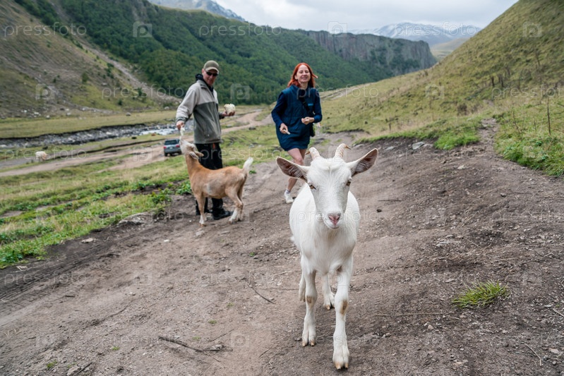 Белая коза и люди, ее кормящие