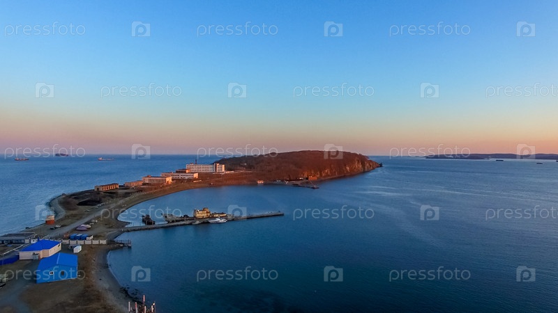 Вид с воздуха на Владивостокский залив на закате. Путешествия, туризм