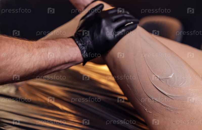 Массажистка наносит крем-скраб на ногу клиентки