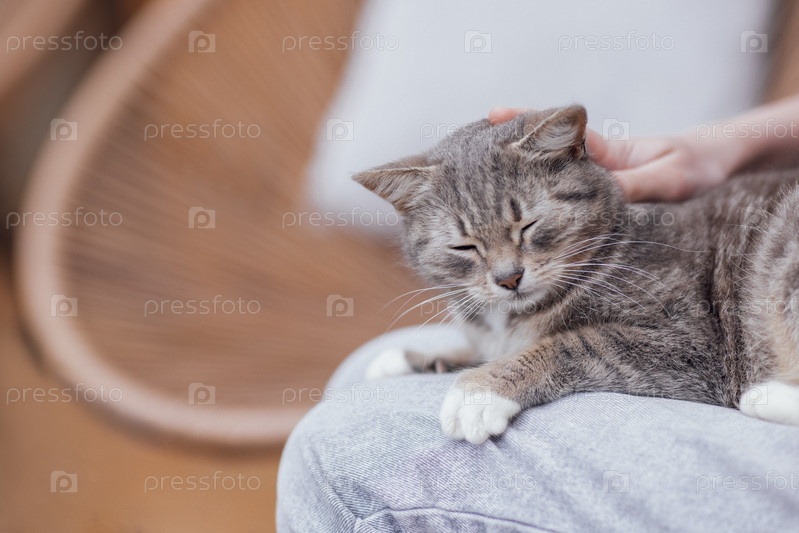 Крупный план милой морды серого полосатого кота в уютной плетеной корзине дома