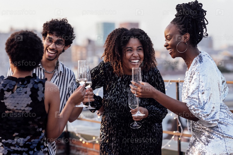 Темнокожая девушка наливает шампанское в бокалы своих многонациональных друзей