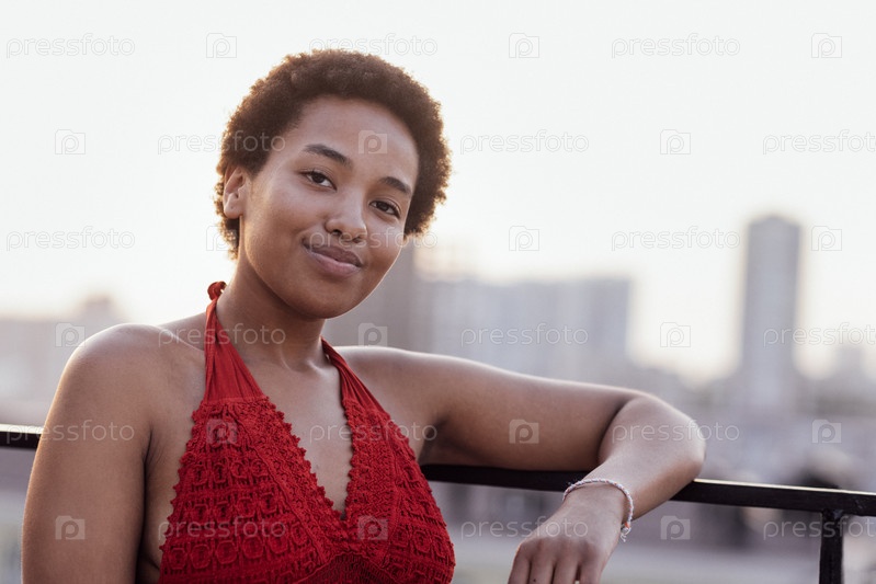 Крупный план женского портрета молодой привлекательной уверенной в себе африканки. Очаровательная темнокожая девушка в красном топе стоит на фоне большого города