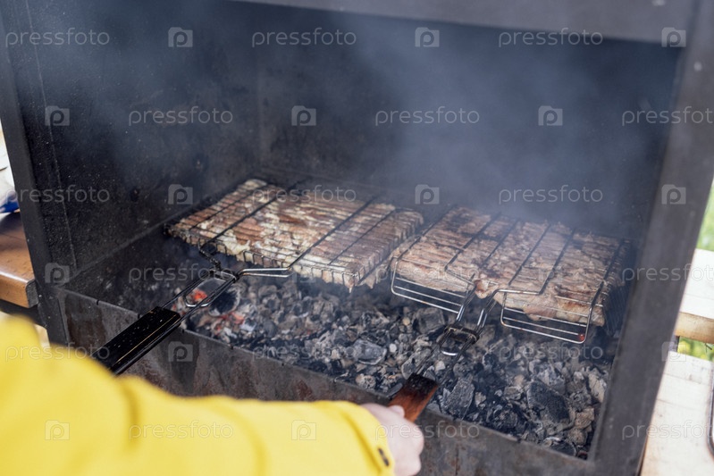 Крупным планом мужчины готовят мясо на решетках. Готовим сочные вкусные жареные кусочки мяса на углях. Вкусный свежий стейк на огне на металлических решетках на открытом воздухе