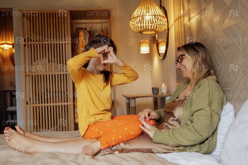 Привлекательная блондинка-мама в очках и ее милая дочь сидят на кровати и улыбаются