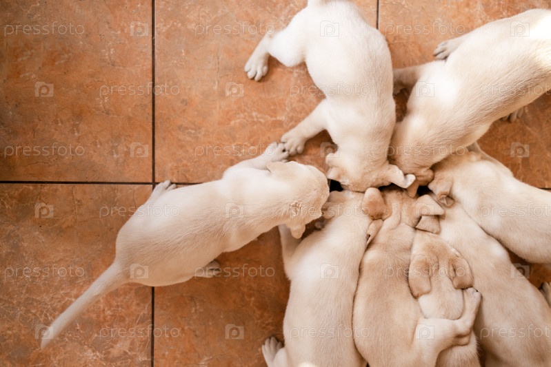 Милые золотистые щенки лабрадора едят собачий корм. Вид сверху