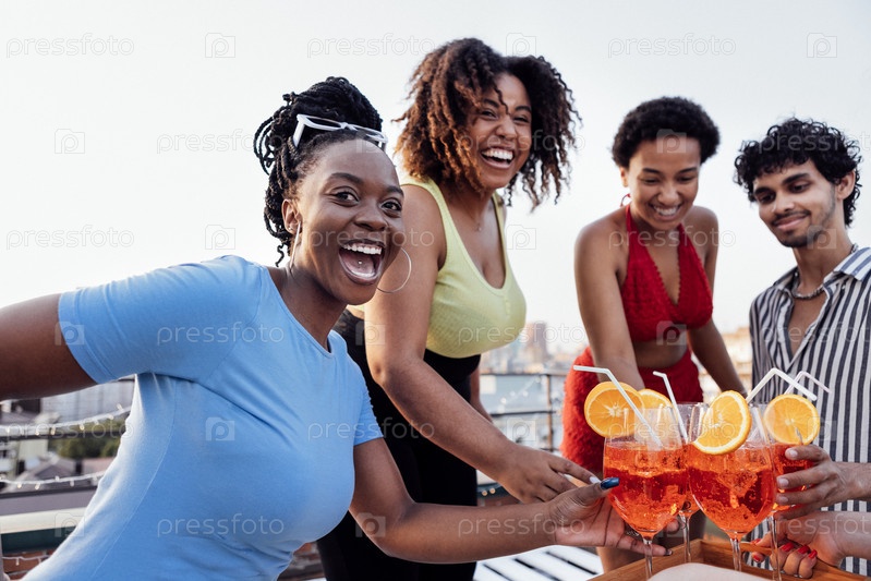 Компания из четырех веселых друзей наслаждается вкусными коктейлями. Вечеринка на крыше