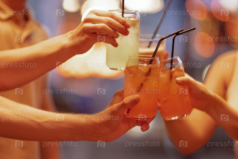 Крупный план женских и мужских рук, держащих стаканы с коктейлями со льдом и щелкающих ими. Друзья произносят праздничный тост с вкусными цитрусовыми напитками через соломинку