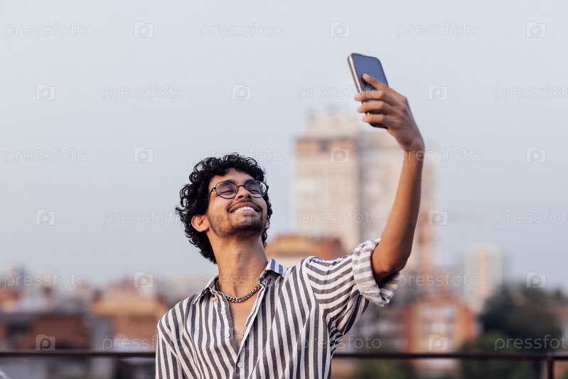 Молодой кудрявый парень в очках и полосатой рубашке отвечает на видеозвонок по телефону