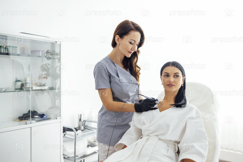 Красивая кавказская молодая женщина делает процедуру удаления родинок в современной косметической дерматологической клинике красоты