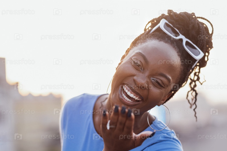 Молодая африканская женщина смеется и посылает воздушный поцелуй. Крупным планом портрет очаровательной темнокожей улыбающейся женщины в солнечных очках
