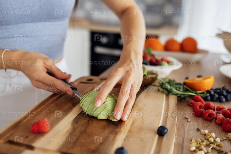 готовит завтрак на кухне.и режет овощи и рыбу. Здоровая пища. Уютный современный интерьер комнаты