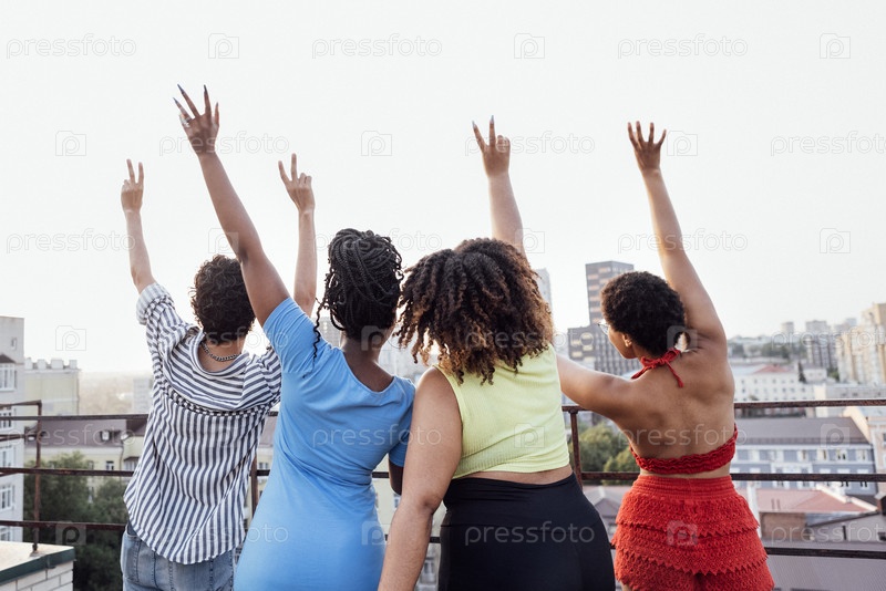 Четверо друзей-друзей машут руками и показывают символ мира. Мужчины и африканские женщины стоят спиной и смотрят на городские здания с высоты