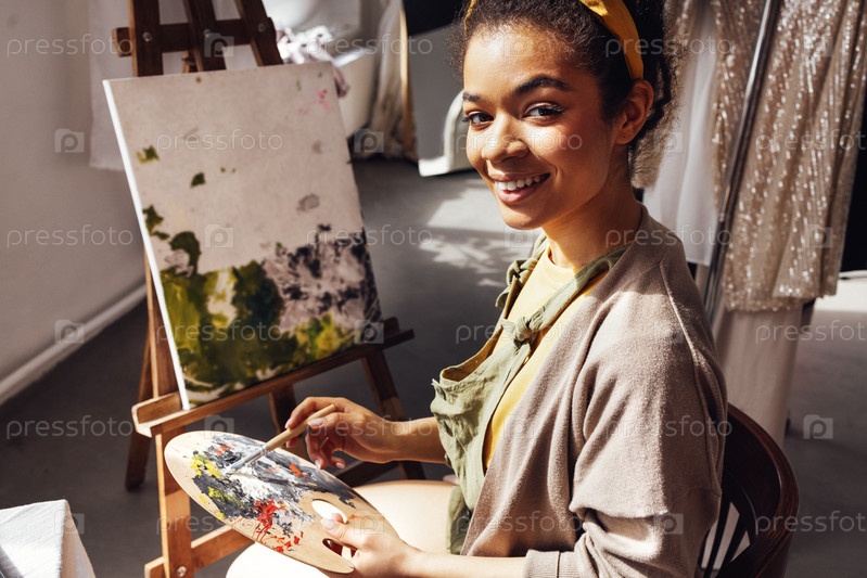 Молодая креативная красивая африканская художница рисует картину масляными красками в художественной студии