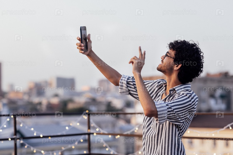 Молодой кудрявый парень в очках и полосатой рубашке отвечает на видеозвонок по телефону. Улыбающийся мужчина смешанной расы показывает символ победы и делает селфи, стоя на крыше дома