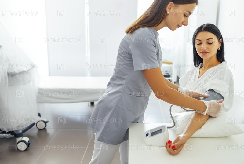 Монитор артериального давления и женская рука с красным маникюром