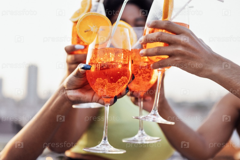 Крупный план женских и мужских рук, держащих элегантные бокалы с длинной ножкой апероля и звенящих ими