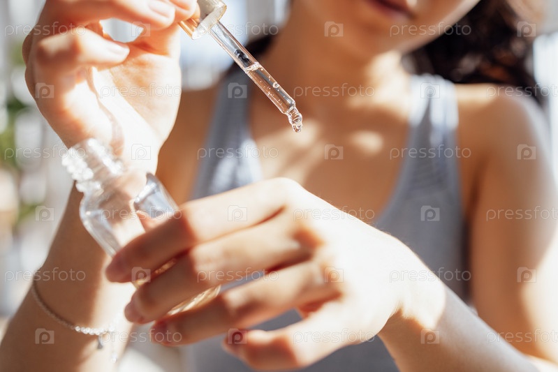 Азиатская женщина применяет антивозрастную сыворотку с витаминами из пипетки