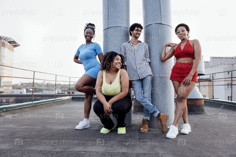 Компания из четырех многонациональных людей позирует на крыше многоэтажного дома. Стильный портрет друзей смешанной расы на фоне металлических труб и города