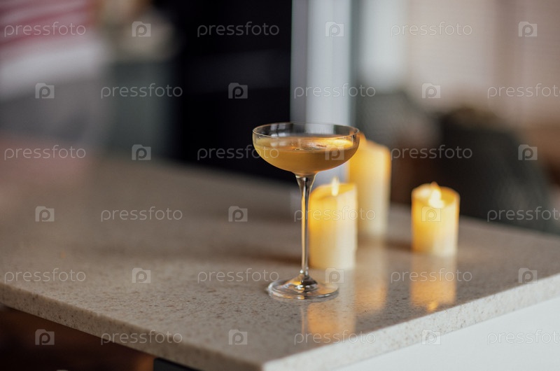 Элегантный бокал на длинной ножке с игристым вином и зажженными свечами. Кубок прохладного шампанского на мраморной столешнице