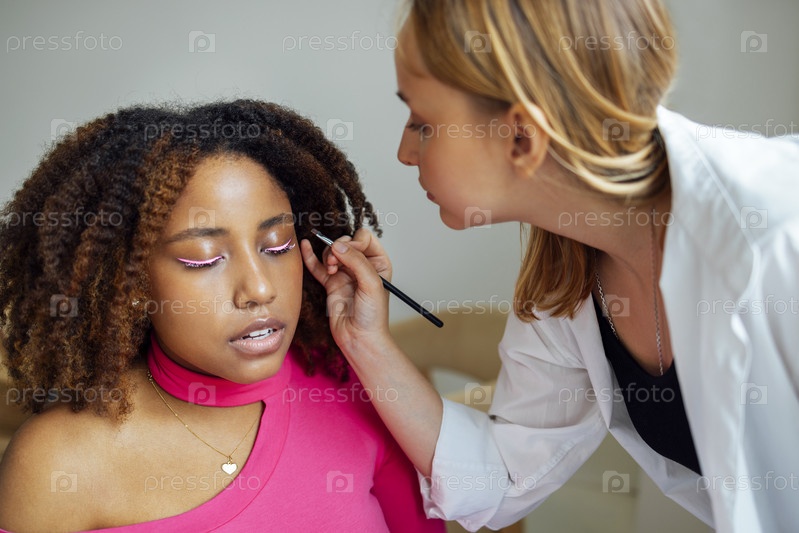 Кавказская блондинка-мастер делает макияж для своей темнокожей клиентки в салоне красоты