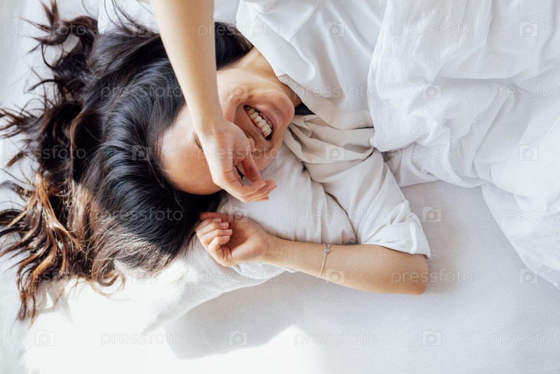 Привлекательная счастливая азиатка лежит утром на белой льняной кровати